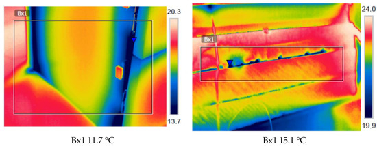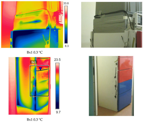 The structural imperfections shown on the example of the cooling module were also identified in the freezing module, where the leakage phenomenon was even more noticeable, which was visible in the exemplary thermograms of the freezing module cabinet in Figure 13.