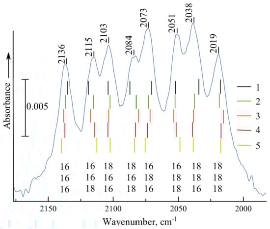 If ozone is prepared from an isotopic oxygen mixture containing the excess of usual 16O (about 57%), the intensities of the eight constituents are not equal, as can be seen from Figure 2, where the figures at each peak show the relative intensity with respect to the total intensity taken as 1. If the abundance of every isotopomer is purely statistical and the absorbance for ν1+3 mode of all eight isotopic species is supposed to be the same (measurements for ozone isotopomers in liquid oxygen [14] show that for some vibrations it could be different for symmetrical molecules like 16O18O16O and asymmetric molecules such as 16O16O18O, but for the ν1+3 mode the relative vibrational transition strengths are almost the same), then the relative intensities of molecules containing 0, 1, 2, or 3 18O atoms for isotopically mixed ozone with 57% 16O should be 0.185, 0.140, 0.105, and 0.08, respectively. A comparison of these figures with those in Figure 2 enables us to divide the three peaks of mixed isotopomers into two groups: those with intensities of 0.17–0.13 and those with intensities of 0.10–0.09. These two groups of bands should naturally be associated with molecules containing one or two 18O atoms, respectively.