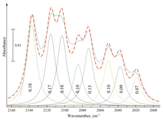 If we adsorb the ozone prepared from a 50:50% isotopic mixture of 16O and 18O, then in the region of the ν1+3 combination immediately after adsorption the structure of six bands arises, forming two triplets typical of symmetrical O3 molecules, as in the spectrum of ozone adsorbed on aerosolized SiO2 [1]. After about 1 h, these bands significantly lose their intensity and a group of more strongly held ozone molecules becomes visible, consisting of eight maxima of almost the same intensity, as shown in Figure 1 (solid line).