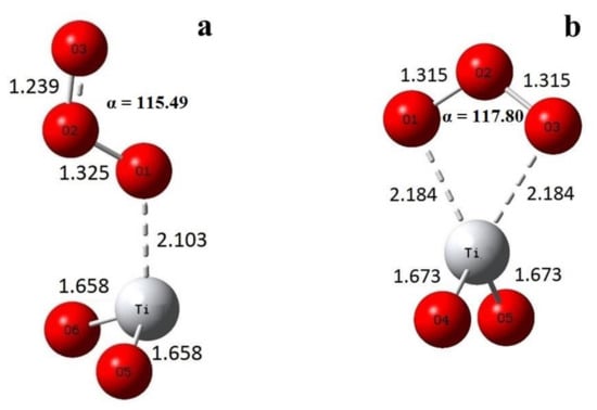 As the simplest model of the interaction of ozone with the uttermost coordinately unsaturated titanium ion, we considered the O3 complex with the TiO2 molecule. Geometry optimization led to two stable structures, the monodentate (a) and bidentate (b) ozone complexes, as shown in Figure 3.