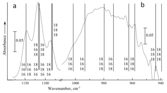 As expected for the localized vibration, the substitution of the second or third oxygen atoms resulted in almost equal large (about 30 cm−1) shifts of the band of ν1 vibration, while the effect of replacement of the first O atom did not exceed 1 cm−1 (Figure 4). As a result, the structure of the split ν1 band is typical of an isotopically mixed diatomic: a triplet with the central band twice as intense as the others for a 50:50% mixture. The frequency of ν3 vibration is sensitive to substitution of the first and second atoms, but the shifts in this case are different, at about 19 and 30 cm−1, respectively. The effect of the third atom is much weaker (about 4 cm−1). A strong bulk absorption of TiO2 below 1000 cm−1 precludes the observation of a better spectrum than that shown in Figure 3b with the resolved peaks of different isotopomers. Nevertheless, the computed frequencies of the ν1+3 combination vibrations shown in Figure 1 are in perfect agreement with the observed spectrum.