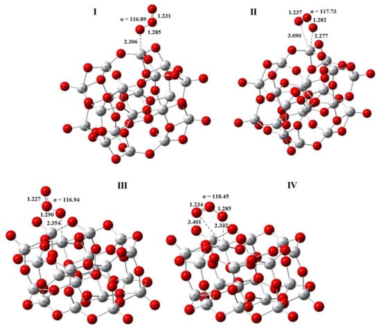 The optimized geometry of the monodentate (I) and bidentate (II) ozone complexes on the 4-coordinated Ti4+ ions, and of the monodentate (III) and bidentate (IV) complexes with 5-coordinated Ti4+ ions of the anatase cluster Ti20O40.