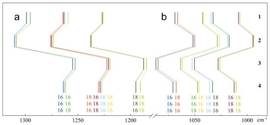 Positions of the bands of ν1 (a) and ν3 (b) vibrations of ozone isotopomers forming complexes with the Ti20O40 cluster. Monodentate with 4- (1) and 5-coordinated (2) Ti4+ ions, and bidentate complexes with the same sites of the latter cluster (3,4).
