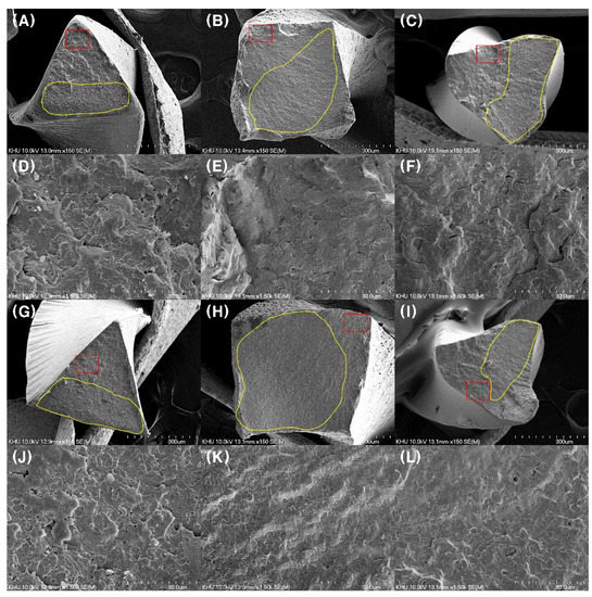 SEM images of fractured surface after cyclic fatigue resistance test. (A–C) Fractured surface of HyFlex CM, HyFlex EDM, and OneFlare after test performed at RT, ductile fracture area was marked with yellow boundary; (D–F) magnified images of box area of (A–C), respectively; (G–I) fractured surface of HyFlex CM, HyFlex EDM, and OneFlare after test performed at BT, ductile fracture area was marked with yellow boundary; (J–L) magnified images of box area of (G–I), respectively.
