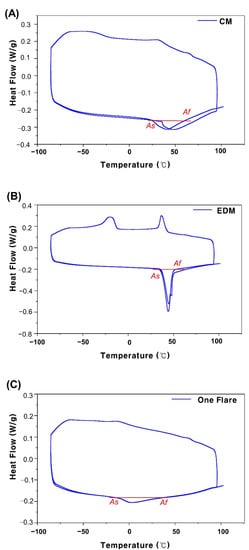 Figure 3 presents the representative heat flow plots for the CM, EDM, and OF. One definite endothermic peak occurred during the heating cycle (lower curve) of CM (Figure 3A) and OF (Figure 3C), and two indistinct exothermic peaks occurred during the cooling cycle (upper curve), whereas the DSC result of EDM showed one definite endothermic peak as well as two definite exothermic peaks (Figure 3B). Austenite start temperatures of CM, EDM and OF were 27.53, 33.91, and −8.8 °C, respectively, and austenite finish temperatures of CM, EDM and OF were 58.3, 52.36, and 39.2 °C, respectively.