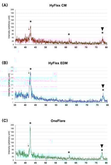 XRD results of HyFlex CM (A), HyFlex EDM (B), and OneFlare (C). Peaks for austenite (*), martensite (arrow) and R-phase (arrowhead) are matched.