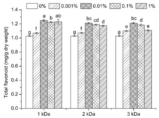 Germination could increase the flavonoid content, which might be owing to the activation of enzymes involved in the biosynthesis of flavonoids from large molecular weight polyphenols such as tannins [26]. Flavonoids contain a diverse group of phytochemicals with antioxidant and anticancer activity, and they have been detected in fruits, vegetables, tea, and wine [27,28]. In order to clarify the effects of chitooligosaccharide on the flavonoid’s accumulation of soybean sprouts, soybeans were treated with chitooligosaccharide before germination. As shown in Figure 3, similar to the changing trend of vitamin C and total phenolics, the total flavonoid content of soybean sprouts was efficiently increased by all chitooligosaccharide elicitors with a molecular-weight-dependent mode. Among them, 1 kDa chitooligosaccharide was the most effective elicitor, and when using it in the concentration of 0.01%, the flavonoids content of soybean sprouts was 1.25 mg/g dry weight, about 22% more than that of the control (1.03 mg/g dry weight). Chitooligosaccharide with the molecular weight of 2 kDa and 3 kDa had a similar promoting action, and they improved the accumulation of flavonoids to 1.21 mg/g dry weight at a concentration of 0.01%. These results are consistent with earlier findings which showed that chitosan could induce the stimulation of secondary metabolism of plants [29].