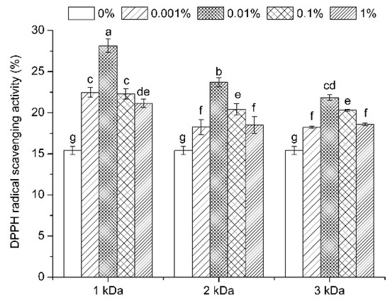 DPPH radical scavenging activity of soybean sprouts under different chitooligosaccharide treatments. The treatments were conducted with chitooligosaccharides of three molecular weights (1, 2, and 3 kDa) at four different concentrations (0.001 to 1%). The control treatment (0%) included the same solutions without chitooligosaccharides. Vertical bars represent the standard error of three replicates. Different letters indicate statistically significant difference (p < 0.05).
