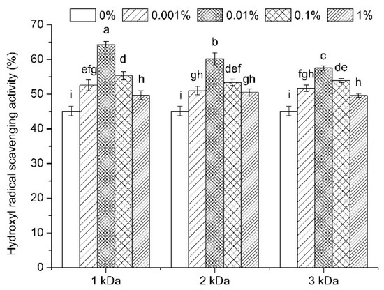 Hydroxyl radical scavenging activity of soybean sprouts under different chitooligosaccharide treatments. The treatments were conducted with chitooligosaccharides of three molecular weights (1, 2, and 3 kDa) at four different concentrations (0.001 to 1%). The control treatment (0%) included the same solutions without chitooligosaccharides. Vertical bars represent the standard error of three replicates. Different letters indicate statistically significant difference (p < 0.05).