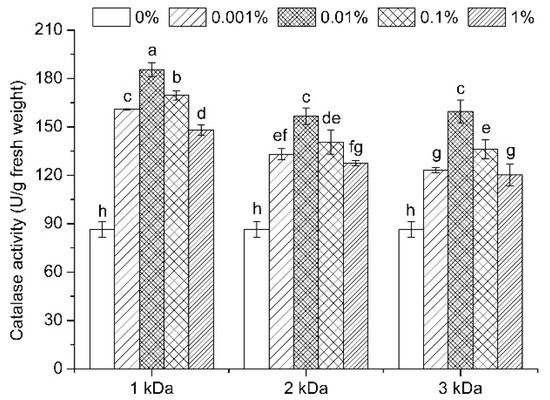 Catalase activity of soybean sprouts under different chitooligosaccharide treatments. The treatments were conducted with chitooligosaccharides of three molecular weights (1, 2, and 3 kDa) at four different concentrations (0.001 to 1%). The control treatment (0%) included the same solutions without chitooligosaccharides. Vertical bars represent the standard error of three replicates. Different letters indicate statistically significant difference (p < 0.05).