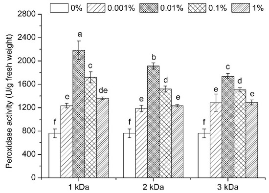 It is known that chitosan has the potential for inducing defense-related enzymes [41], so the enzymatic activities, including catalase and peroxidase, in soybean sprouts after treatments of chitooligosaccharide were studied. Results showing catalase activity of soybean sprouts in different treatments were presented in Figure 6. In general, the treatments of chitooligosaccharide depicted higher catalase activity, among which, the highest increase was treatment with 0.01% of 1 kDa chitooligosaccharide, and resulted with 185.55 U/g fresh weight. Treatments with 2 kDa and 3 kDa chitooligosaccharide had similar stimulation effects on the activity of catalase, and at a concentration of 0.01%, they improved the activity of catalase to 156.67 U/g fresh weight and 159.64 U/g fresh weight, respectively. Regardless of the molecular weight, chitooligosaccharide with a concentration higher or lower than 0.01% has less elicitor activity. Catalase can detoxify H2O2 to water, thereby reducing the damage of reactive oxygen species to plants. The increase in the activity of catalase was most likely a response to the increased generation of reactive oxygen species and indicative of oxidative stress [42].