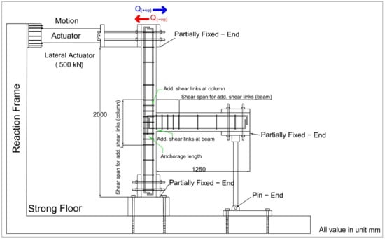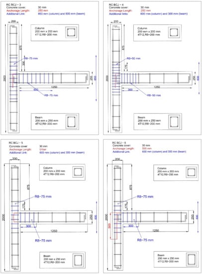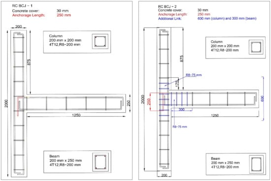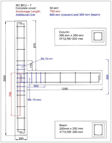 In this research, seven beam-column exterior reinforced concrete (RC) joints with a column dimension of 2000 mm × 200 mm × 200 mm and a beam dimension of 1250 mm × 200 mm × 250 mm. Type I ordinary Portland cement (OPC) obtained from Tasek 111 Corporation, Berhad, Malaysia, was used in the concrete mix design. The cement is in accordance with quality conforms 112 to EN 196. The concrete compressive strength was evaluated in accordance with the BS EN 12390-3:2009 standard [28]. Three specimens were tested for each RC beam-column joint. The average compressive strength of the cubes ranged between 41.1 MPa to 47.7 MPa. The steel reinforcement had an average tensile strength of 614.15 MPa, meeting the requirements of BS EN 10002-1:2001 standard [29]. Table 1 summarizes the reinforcement details for each RC beam-column joint. Figure 1 illustrates the reinforcement detail for each RC beam-column joint investigated. The additional shear link spacing and increased anchorage length in specimens BCJ-2 to BCJ-7 were arranged based on the ductility class medium (DCM) for low to moderate seismicity [30,31,32].