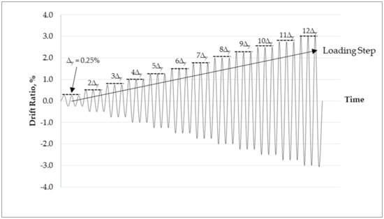 Figure 2 illustrates the schematic drawing for the experimental test setup implemented. The ends of the RC beam-column were partially fixed. A 500 kN horizontal hydraulic actuator was attached to the top portion of the column. The bottom portion of the column was braced to the surface of a strong floor. An axial circular steel pin was attached to the strong floor and the end of the beam. The specimens were experimentally tested using displacement control mode with simulated earthquake loading under lateral cyclic loading [35]. The cyclic loading history is presented in Figure 3 and is in accordance with the ACI 374.2R-13 standard [36]. Each specimen was subjected initially to cyclic loading with a drift ratio (∆y) of 0.25%. The drift ratio (∆y) was then increased by 0.25% in each step until reaching a drift ratio (∆y) of 3.00%, or specimen failure is observed. At each drift ratio (∆y) level, the specimens were subjected to three cycles. The drift ratio (∆) was defined as lx/H, where lx is the lateral movement and H is the column height [37]. Dinolite microscope camera was used to measure and analyze the crack width in every drift ratio (DR) level during testing, as recommended in earlier studies [38,39,40,41].