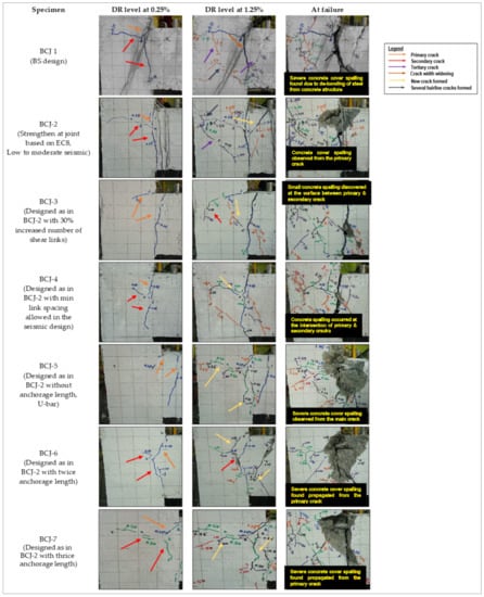 The crack pattern and width of the specimens were monitored during the lateral cyclic loading test to assess the effect of the increased number of shear links and anchorage length. Figure 5 illustrates the crack formation on the selected joint area for BCJ-1 (control), BCJ-2 (strengthen by Eurocode 8), BCJ-4 (representing additional shear links), and BCJ-5 (representing anchorage length) at the drift ratio level of 0.25%, 1.25%, and 2.25%, including at the failure. In the case of control specimen BCJ-1, the primary flexural crack initially formed at a drift ratio level of 0.25% from the top corner of the joint area and then propagated downwards to create two new secondary cracks at the intersection area between the beam and the joint panel. Moreover, numerous hairline cracks at 45° appeared at the joint interface, which extended from the primary and secondary cracks in specimen BCJ-1. For specimens BCJ-2 and BCJ-4, the primary/flexural crack was initiated at a drift ratio level of 0.25%, similar to specimen BCJ-1. However, the width and length of the crack were smaller than those of the control specimen. For BCJ-5, two primary cracks were formed at the early stage of the loading protocol. At the drift ratio level of 1.25%, a shear crack formed at 60°, and connected to the primary crack.