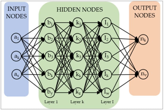 The basic framework of ANN requires three layers (Input, Hidden, and Output) [67], as shown in Figure 6. The input layer is the first layer where data/features are obtained, and some standardization techniques are used to restrict inputs to a certain set. The structured inputs make the neural network work easier, resulting in better accuracy. Depending on the network application, the hidden layer (intermediate or invisible) may be a collection of layers. Such layers are responsible for identifying the pattern of a process or device. Most operations of the neural network are carried out in these layers. The output layer also contains neurons representing the outputs of the final network generated from the previous layers of neuron processing. The basics of ANN’s composition involve neuronal interconnection and layer formation. Therefore, they may categorize their temperament into four different types. Such types include feed-forward single-layer, mesh, recurrent, and feed-forward multi-layer networks.