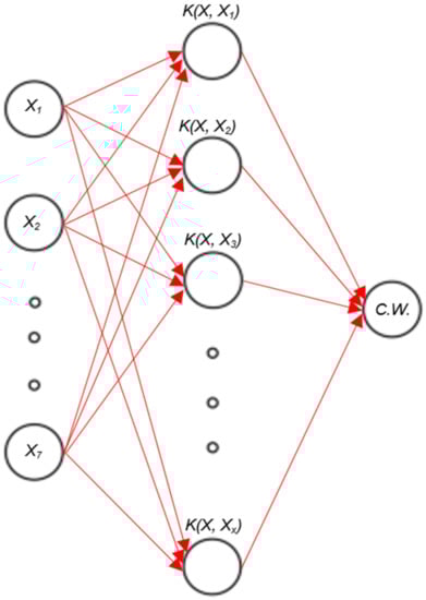 where C is the pre-specified SVM tolerance parameter, and are slack variables in determining the degree to which data points will be penalized if the error is larger than precision parameter . is the insensitive loss function. The SVM training algorithm will rely only on the data in high-dimensional space via dot products. In addition, the kernel function generated in Rapidminer can be used to approach the dot products in high-feature dimension space as in Equation (4) and in Figure 8, we only need to use K in the SVM training algorithm without specifically treating the function space to obtain the specific formulation of the algorithm of . The kernel parameters must be carefully selected because they are important to define the high-dimensional space and to monitor the complexity of the final solution. Because SVMs are primarily defined by the types of their kernel functions, it is important to choose the correct kernel function and kernel parameters for each application problem to ensure satisfactory results. A trial-and-error technique was used to pick the kernel-specific parameters.