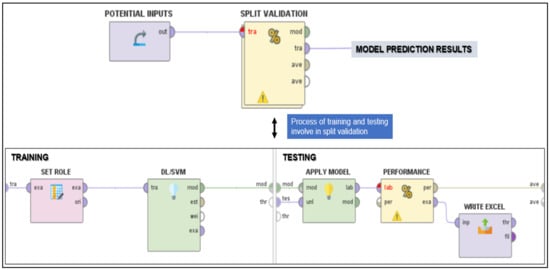 In this research, the framework model was used, as illustrated in Figure 9. The regression performances of classification for all models were evaluated by the labeling dataset, where the inputs data were attributed with label roles, while an attribute with prediction role for experimental crack width data. The attribute of the label stores the real observed values, while the attribute of prediction stores the label values expected by the regression models. Training with a collection of sample data called a training set generates the models. Trained models were then provided with the test set to predict the accessible accuracy of data on crack widths. For the simulation, nine numbers of potential inputs vectors were selected, and a split data ratio of 75:25 (training set to test set ratio) was applied for all prediction models. The prediction models are described further in the following Section 5.1.