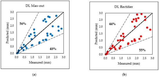 Developing a structural quality model with adequate prediction accuracy can be challenging, especially when modeling the crack width of RC beam-column joints area subjected to lateral cyclic loading with respect to different levels of drift ratios. In this research, four ANN prediction models, including deep learning (DL) max-out, deep learning (DL) rectifier, support vector machine (SVM) dot, and support vector machine (SVM) neural, were used. These methods provide an optimized framework for machine learning, data mining, and text mining and are fast and easy to use [48,49,50].