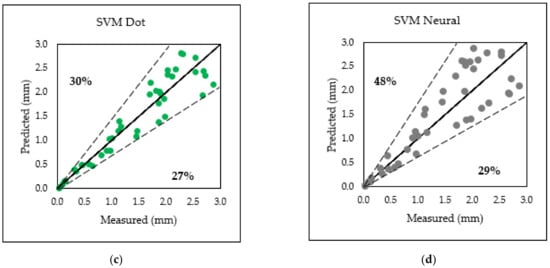 - SVM—dot kernel prediction model exhibited 30% fewer discrepancy values between measured and predicted crack width compared to DL—max-out (56%), DL—rectifier (55%), and SVM—neural (48%) and was therefore chosen.