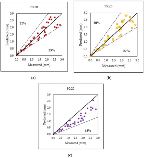 Results show that the split ratio of 70:30 with the lowest error of predicted crack widths (25%) near the reference line. It is, thus, a better split ratio for the SVM—dot than 75:25 (30%) and 80:20 (48%) of split ratios. Most of the plotted predicted points for the 80:20 split ratio were far below the equity/measured line, due to unbalanced data from a smaller number of datasets, thus, providing high variance in prediction, which can significantly change testing accuracy. In other words, significant under-fitting in the 80:20 split ratio may cause redundancy in experimental output data. Past studies have shown that the proportion chosen in the analysis for fewer numbers of datasets (≤1000 data) was 70% for the training set and 30% for the test. The idea is that more training data is preferred because it makes the classification and regression models better, whilst more test data makes the error estimate less accurate [85,86,87]. For this dataset, the 70:30 split is within this experimental range and is a reasonable choice. The trade-off is simple as less the testing data, bigger the variance performance of the model algorithm, while more the training data, smaller would be the variance in parameter estimates. From this 70:30 split ratio graph, further optimizations are analyzed and discussed based on the number of input parameters selected in the following sub-section.