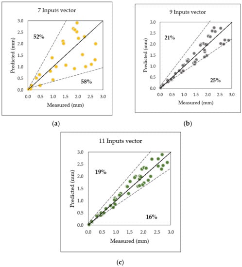 To define the optimal functional type of regression models, the choice of input variables is central and crucial. The role of selecting input variables is common to the creation of most models of regression and depends on the discovery of relationships within the available data to identify acceptable model output predictors. The difficulty of the input variable selection task is somewhat alleviated in the case of parametric or semi-parametric empirical models by a-priori assumption of the model’s functional form, which is based on some physical interpretation of the underlying system or process being modeled. In the case of ANN, however, there is no such inference about the model’s structure. The input variables are instead chosen from the available data, and the model is subsequently developed [88]. Consequently, three different types of input variables are used, as seen in Table 4, to integrate flexibility and prevent duplication, providing a more reliable model of prediction. The results for variable input vectors in determining the correlation and consistency between predicted and measured crack widths are presented in Figure 12.