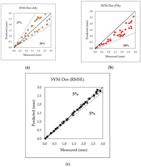 From the above figure, RMSE can be seen to exhibit a more consistent standard deviation of residuals (prediction errors) up to 5%, approaching actual crack widths compared to AE (26–37%) and PA (50%). The inconsistent prediction performance was found over-fitting in the case of AE and under-fitting in the case of PA from the reference lines, respectively. The extent of error found in the prediction model associated with AE and PA may be considered from the point of view of accuracy. The accuracy of measurement reflects the error or variance of the measurement from the average of a large number of measurements of the same quantity, whereas the precision of a measured value expresses the deviation of the measurement from the real quantity value. Error is viewed from the point of view of precision when the true value is known, but it must be used instead of accuracy when the true value of a quantity is not known. Accuracy cannot be achieved if the precision cannot be reached; however, precision does not guarantee accuracy. Residuals were calculated as to how far the data points were from the regression line; RMSE was assessed as to how these residuals were spread out. In other words, it shows how clustered the data is around the best fit axis, thus supporting the argument through a previous study in which RMSE was able to avoid over-fitting in positive identification [62,65]. This parameter of the RMSE index is, therefore, a simple, quick, and reliable metric compared to other parameters, widely used in climate analysis, forecasting, and regression to validate experimental results [50,64,94].