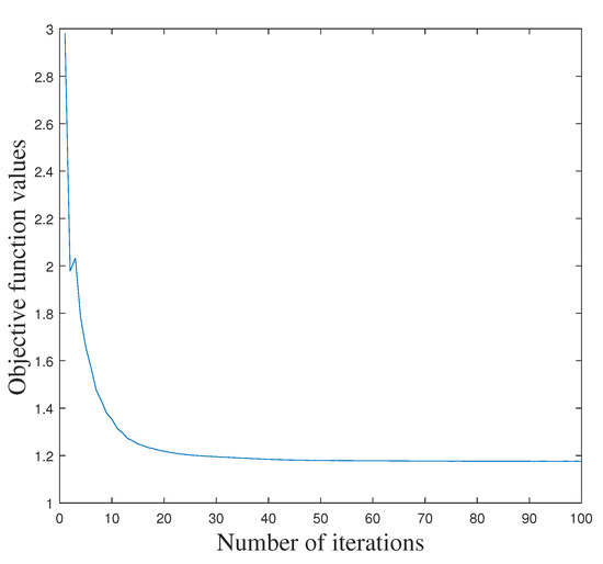 By repeating the steps (a)–(d), we can iteratively obtain all the optimal variables . The overall optimization of our LPLC-HDL is summarized in Algorithm 1. Moreover, the objective function value of Equation (4) decreases as the number of iterations increases on a given dataset. For example, the convergence curve of LPLC-HDL on the Yale face dataset [29] is illustrated in Figure 1. From it we can see that the proposed algorithm converges quickly, no more than 20 iterations.