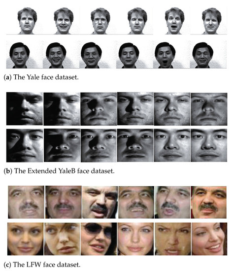 The LFW face dataset has more than 13,000 images with the name of the person pictured, and all of them are collected from the web for unconstrained face recognition and verification. Following the prior work [7], we use a subset of the LFW face dataset which consists of 1215 images from 86 persons. In this subset, there are around 11–20 images for each person, and all the images are resized to be . Some samples from this face dataset are shown in Figure 2c. For each person, eight samples are randomly selected for training and the remaining samples are taken for testing. The parameters of LPLC-HDL on the LFW face dataset are also shown in Table 1. In addition, the hybrid dictionary size is set to + 86 = 430, which means four class-specific atoms for each individual and 86 shared atoms for all the individuals.