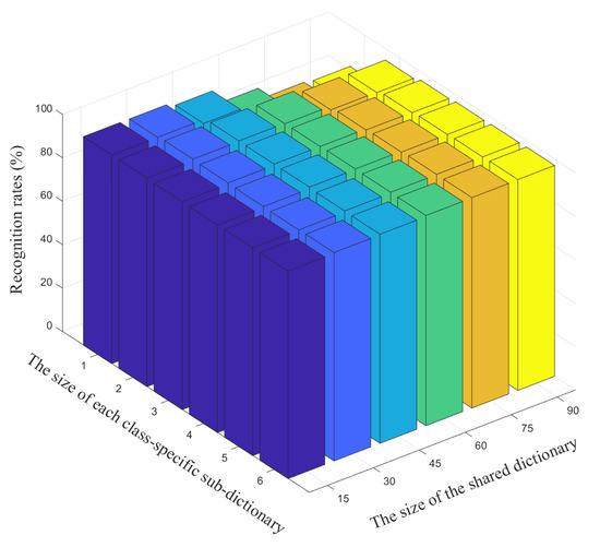 where , is the dictionary shared by all the classes, is the ith class sub-dictionary, and are the coding coefficients of the samples from the ith class over and , and and denote the functions about the hybrid dictionary and the coding coefficients, respectively. The constraint of typically adopts [26] norm or [25,27] norm for sparse coding.