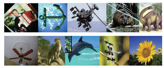 In this subsection, we evaluate LPLC-HDL on the Caltech-101 dataset [23] for object classification. This dataset contains a total of 9146 images from 101 object categories and a background category. The number of images for per category varies from a minimum of 31 to a maximum of 800 images. The resolution of each image is about , as shown in Figure 4. Following the settings [6,40], we perform the Spatial Pyramid Features (SPFs) on this dataset. Firstly, we partition each image into sub-regions with different spatial scales L = 0, 1, 2, then extract SIFT descriptors over a sub-region with a spacing of 8 pixels and concatenate them as the SPFs. Next, we encode the SPFs with a codebook of size 1024. Finally, the dimension of the features is reduced to 3000 using the the Principal Component Analysis (PCA) algorithm.