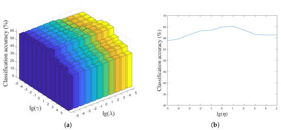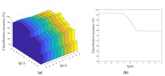 By fixing the parameters and , the classification accuracy versus different values of the parameter are shown in Figure 6b and Figure 7b. From them we can see that the classification accuracy is insensitive to the parameter when its value located in a certain range, e.g., on the Yale face dataset. It should be noted that the incoherence between the shared and class-specific dictionaries is increased with increasing parameter , which influences the reconstruction of the test data and decreases the classification accuracy.