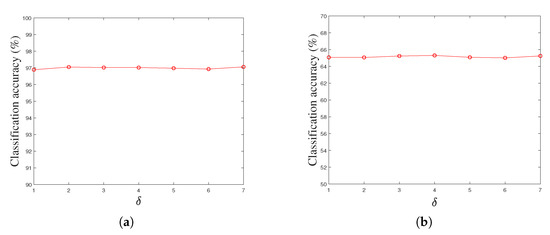 Besides the key parameters , and in our LPLC-HDL method, there are also the parameters and k in the proposed locality constraint. In the experiments, we find that these two parameters have stable values on the experimental datasets. For example, Figure 8a,b show the classification accuracies of our LPLC-HDL method with respect to the parameter by fixing the remaining parameters on the Yale face dataset and the Caltech 101 dataset. From the subfigures, we can see that the classification accuracy is insensitive to the parameter , and the approximate best result can be obtained when . For the parameter k, this similar phenomenon can be observed on the experimental datasets. Thus we can set and in our LPLC-HDL method for convenience of calculation.