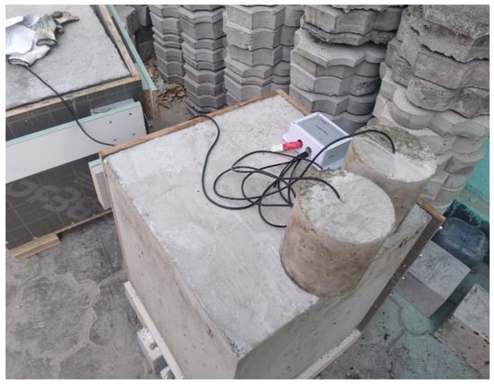 To examine the proposed concept: a batch of cement-based concrete mixture of class B25 and grade M350 was retrieved from an operating concrete mixture manufacturing plant. The concrete mixture was used to prepare 17 vertical cylindrical samples with a diameter of 15 cm and a height of 15 cm [], 15 cubes with an edge size of 10 cm [] and 2 boxes 50 × 50 × 50 cm in size [] at once, depicting the real structures on the site. All the samples and boxes were kept at the same temperature and humidity conditions. For compression testing on the 1st, 3rd, 7th, 14th and 28th days, 15 cylindrical and 15 cubic samples were prepared to be used in batches, three pieces at a time. The temperature sensors were inserted in the middle of the 2 cylindrical samples and 2 boxes and logged every 30 min for 28 days (Figure 1). Along with internal temperature, two more sensors were recording the ambient temperature and ambient relative humidity at the same time, by analogy with [].