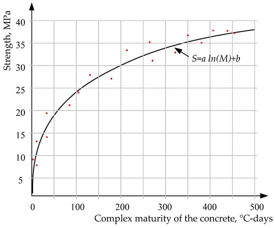 Correlation coefficients and weights for each of these parameters were calculated for every day in Table 2, and the mean value of the weight for the 28-day period is used in Equation (2). To determine the complex maturity–strength relationship, the trend line with the most fitting equation was drawn between the compressive strength of cylindrical samples and the complex maturity calculated by Equation (2). The resulting trend line corresponds to the logarithmic dependence S = a·ln(M) + b in Figure 3, where S is strength, and M is the maturity of the concrete. The obtained complex maturity–strength relationship is used later to determine the current strength of the concrete by monitoring internal and ambient temperature and ambient relative humidity.