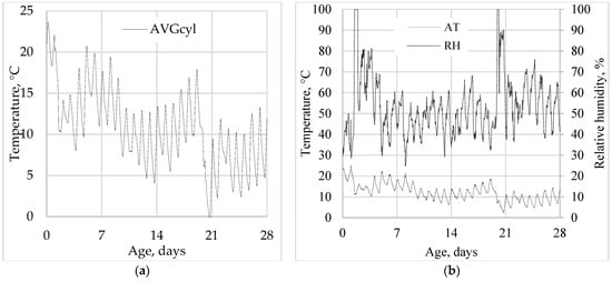 Daily fluctuations in daytime and nighttime represent a spiky graph within certain limits; nevertheless, it is possible to trace the exothermic reaction that takes place during the curing of the concrete. The ambient temperature was positive during the concrete curing and varied between 3 and 25 °C within 8–18 °C prevailing fluctuation. The ambient relative humidity generally showed a rather dry environment of 40–60%, with two time jumps over four weeks of curing (Figure 5b).
