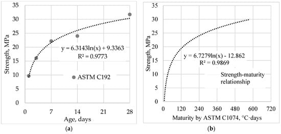 Concrete strength gained over time: (a) Compressive strength on the 1st, 3rd, 7th, 14th and 28th days; (b) Maturity–strength relationship according to [].