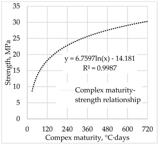 In Figure 7, the complex maturity values calculated by Equations (2)–(7), and including the impact of IT, AT and ARH parameters, were presented in relation to the compressive strength cylinders, determined in Figure 6a. The corresponding trend line in natural logarithm approximation and a coefficient of determination R2 = 0.9987 confirm the high convergence. Knowledge of the relationship between the compressive strength and the complex maturity, determined for a given concrete mixture, enables estimation of the strength at any value of complex maturity on the site. For the concrete class B25, the necessary value to continue the construction is 22.4 MPa, which corresponds to 70% of standard strength of 32.0 MPa on the 28th day.