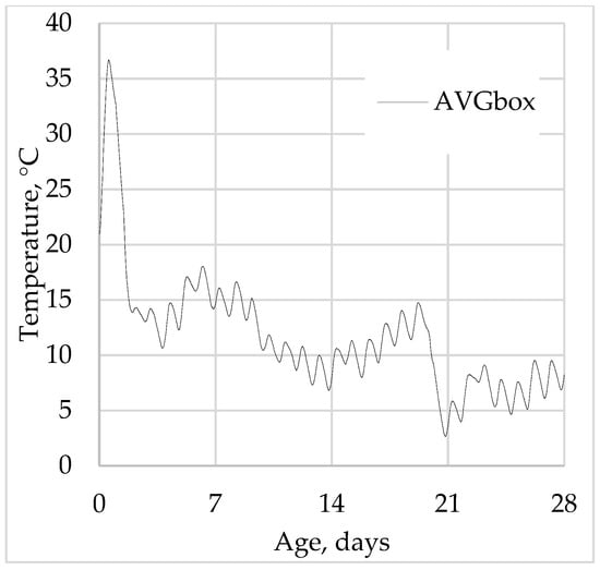 Internal temperature monitoring of the concrete samples in vertical cylinder molds and its average values are presented in Figure 5a for 28 days of curing.