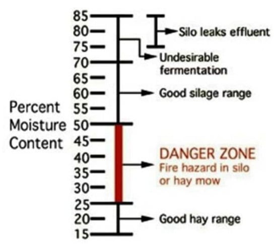 Other fundamental concerns relate to the specificity of the technology. The K-CRISP system works best using the Monte Carlo fire simulation model and FireGrid systems [45,48]. There is no guarantee that it would function as intended using alternative mechanisms due to concerns about the accuracy of AI-based networks in modeling the potential sources of heat that can cause fires in farms. Field [23] noted that fires in agricultural settings could be triggered by heat generated by stored grains. Such heat is generated via anaerobic fermentation and aerobic respiration, which are natural postharvest biological processes that occur as grains lose excess moisture to attain equilibrium in the moisture content. If the storage structures lack appropriate vents for heat to escape through, there is an imminent risk of pyrolysis even in the absence of oxygen [23]. Similar fire risks were documented during the storage of grains stored in biomass fuels in large storage units [49]. In the latter case, the risk of self-ignition was attributed to self-heating. The correlation between fire hazards and the moisture content in silos is depicted in Figure 2. Beyond grain-moisture-specific fire hazards, there are varied concerns about the impact of a different confounding factor. The severity of the fire hazard is predicted by the effect of wind on the fire target and doorway pressure, velocity, and temperature [50]. In other cases [51], the maximum concentration of oxygen (MOC) has been proven to predict the risk of a fire hazard in grain silos.