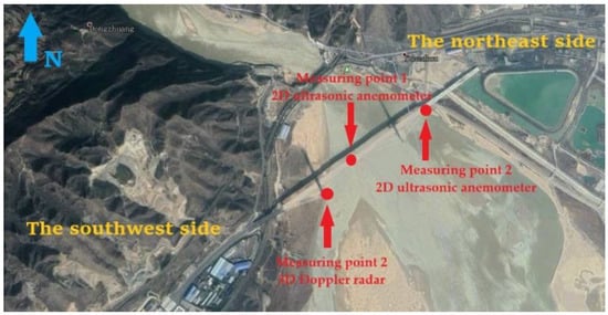 In this study, we selected the site of a large cable-stayed bridge. Temporary wind observation stations needed to be set up in agreement with the actual needs of the project to ensure that the observations were relevant, representative, and accurate. To understand the spatial distribution characteristics of the wind field around the bridge site, three measuring points were set up at the end of November 2017. One 3D Doppler radar was set on the bank of the river near the main bridge, and its relative position is approximately at the mid-span of the main girder. Two 2D ultrasonic anemometers were set at the height of the main girders, and their relative positions are respectively located at 1/4 of the northeast side and southwest side of the bridge span. The instrumentation details for each site in the observation study are listed in Table 1, and the site location layout details are depicted in Figure 1. The mean wind characteristics were obtained by 3D Doppler radar, and the pulsating wind characteristics were obtained using a 2D ultrasonic anemometer.