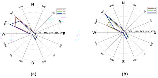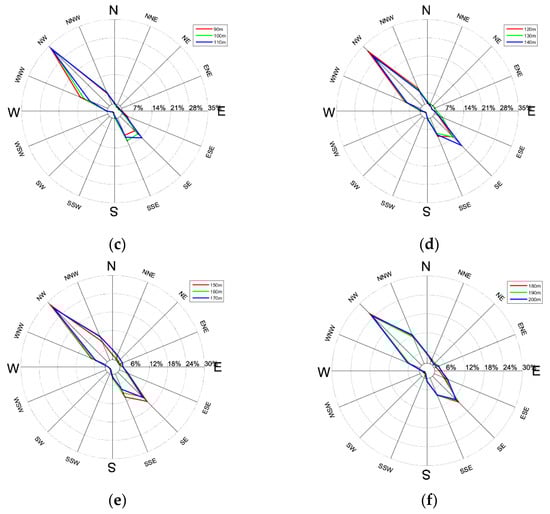 Wind direction rose diagram in the range of 30~200 m: (a) wind direction rose diagram from 30 m to 50 m; (b) wind direction rose diagram from 60 m to 80 m; (c) wind direction rose diagram from 90 m to 110 m; (d) wind direction rose diagram from 120 m to 140 m; (e) wind direction rose diagram from 150 m to 170 m; (f) wind direction rose diagram from 180 m to 200 m.