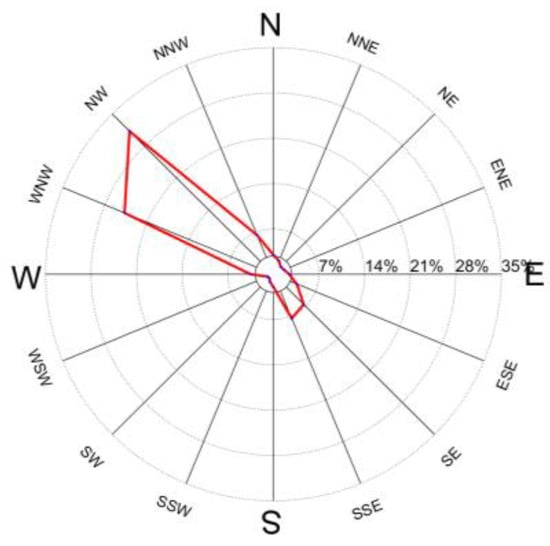 The sample source for each measuring point plotted is the mean wind direction over 4000 ten-minute windy periods, as shown in Figure 4. The wind rosette at the 30 m altitude, based on the phased-array Doppler radar system, is shown in Figure 4; a large difference between Figure 3 and Figure 4 can be observed. Although the height of the anemometer setup on the southwest side was close to the Doppler radar measurement point at 30 m altitude, there was a difference in the location of the two setups. The Doppler radar was located near the bank of the river on the southwest side, while the anemometer placement was more toward the center of the river. The frequency of the WNW component of the southwest lateral anemometer was significantly higher than that of the Doppler radar results, while the Doppler radar captured the wind direction between the ESE and SSE bearings. The reason for these findings is that the closer the device to the riverbank, the more significant the disturbance produced by the hills and surrounding buildings from the northwesterly wind from the horn, and the more diffuse the wind distribution results. The anemometer was located near the bank of the river. Its main wind direction, WNW, was close to the direction of the continuum between the center of the bell and this measurement point. The incoming front of the anemometer on the northeast side was more open, so its wind direction was widely distributed between the WNW and NW directions. Between these two orientations was the exact opening orientation of the horn. The southwest side was much more obscured by the mountains, and the NW wind blocked the other components of the wind other than the NW bearing. Thus, its main wind direction was closer to the river. We observed a common pattern in the distribution of wind direction on the northeast and southwest sides. The main wind directions all inclined to the center of the river, and the probability of wind direction distribution was smaller near the riverbank position.