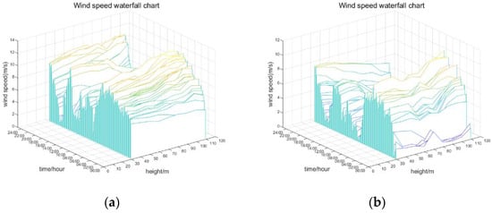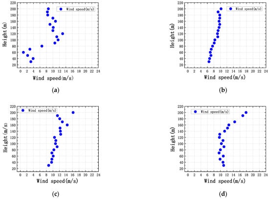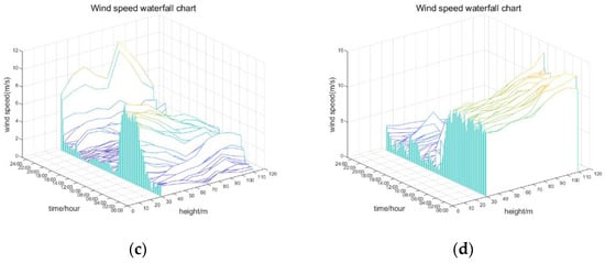 Wind speed waterfall diagram: (a) 14 November 2017 (autumn); (b) 27 February 2018 (winter); (c) 29 April 2018 (spring); (d) 22 July 2018 (summer).