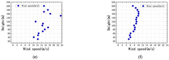 According to the specification, the surface roughness range near the bridge site was assumed to be between 0.22 and 0.30. The 3D Doppler radar can simultaneously obtain wind speed data for 18 altitudes ranging from 30 to 200 m. The actual observation results showed that if all the data from the 18 measurement points are required to be reliable, it will result in a small number of samples that can be processed, and if the unreliable data from the wind speed at each altitude are removed, sometimes too many data are removed, affecting the accuracy of the fit. Therefore, to ensure the accuracy of the study results, the following principle was adopted in this study: after eliminating invalid data from 18 heights in the same time period, the data greater than or equal to 15 were considered to be available for the sample. These were used to fit the wind profile during the observation period. The sample wind speed is also an important factor affecting wind profile fitting results. If the wind speed is too low, the wind profile often does not have a stable form. Therefore, in this study, the mean wind speed at all altitudes greater than 5 m/s was chosen as a threshold, and a total of 4000 study samples were obtained. According to the exponential law using the least squares method to fit the wind profile, the wind profile data were divided into six forms, as shown in Figure 5. The distribution of form (a) is messy, so it is called messy type. Form (b) complies with the exponential law well. The distribution of form (c) is relatively regular. The distribution of form (d) is opposite to the exponential law, so it is called reverse type. The forms of (e) and (f) are like large and small zigzags, respectively. As the height increases, the mean wind speed shows a gradually increasing law in general. Due to the complex topography, the pattern of wind speed variation with height does not fully comply with the exponential law.