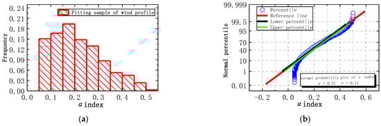 Sample distribution of wind profile index: (a) α histogram of exponential frequency distribution; (b) normal probability plot of the α index.