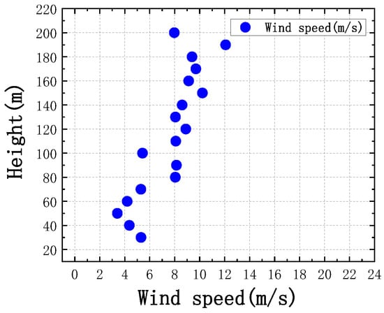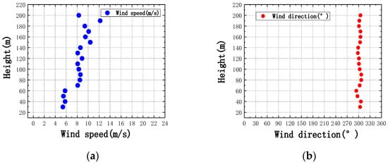 Figure 7 shows the results of the fitting of the wind profile and the corresponding distribution of the wind angle with height for the same time period. During the same time period, the wind angle remained generally stable at all heights and was distributed around 300° at all heights. This direction is roughly consistent with the direction of the horn pointing downstream of the river in this topography. The analysis of the large number of samples showed that when the wind direction angle was discrete at all heights, the wind speed distribution was also discrete. Additionally, the wind speed and wind direction showed a correlation in terms of distribution stability.