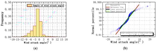 Frequency statistics of wind attack angle: (a) frequency distribution of wind attack angle; (b) normal probability diagram of wind attack angle at a 30 m height.