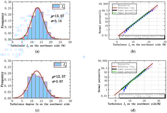 Probability statistics of turbulence Iu downwind: (a) turbulence degree Iu on the northeast side; (b) normal probability diagram of turbulence Iu on the northeast side; (c) turbulence degree Iu on the southwest side; (d) normal probability diagram of turbulence Iu on the southwest side.