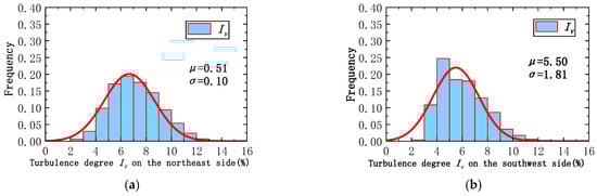 Probability statistics of crosswind turbulence Iv: (a) turbulence degree Iv on the northeast side; (b) turbulence degree Iv on the southwest side.