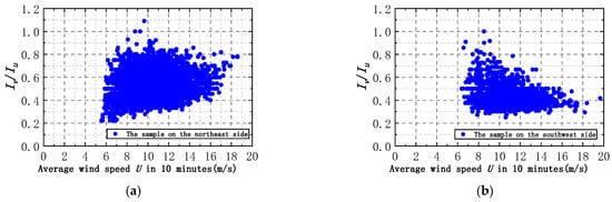 The correlation between the turbulence ratio Iv/Iu and the mean wind speed U: (a) the northeast side; (b) the southwest side.